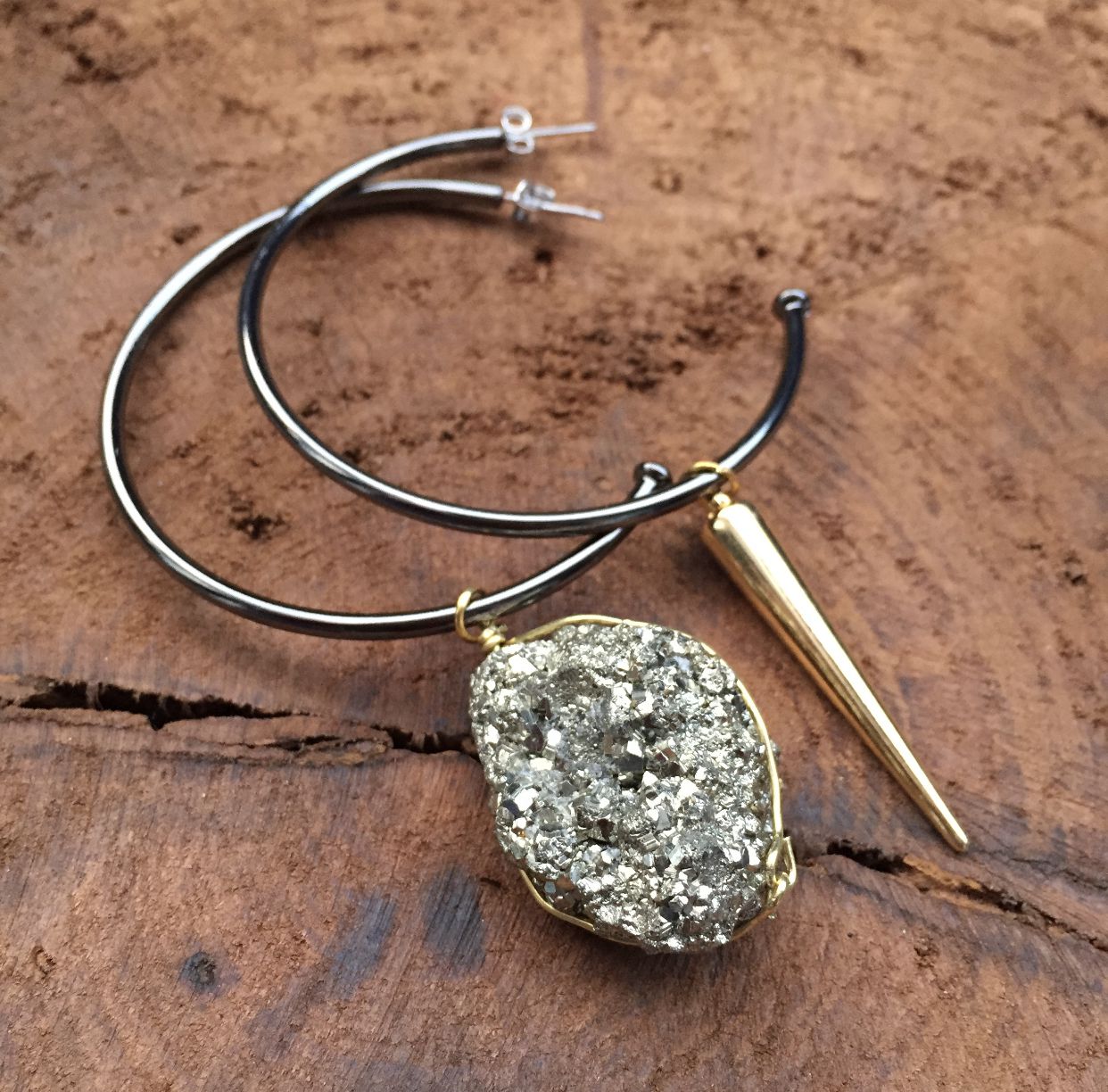 Argola em metal escuro, pingente pino dourado e pedra Pirita.