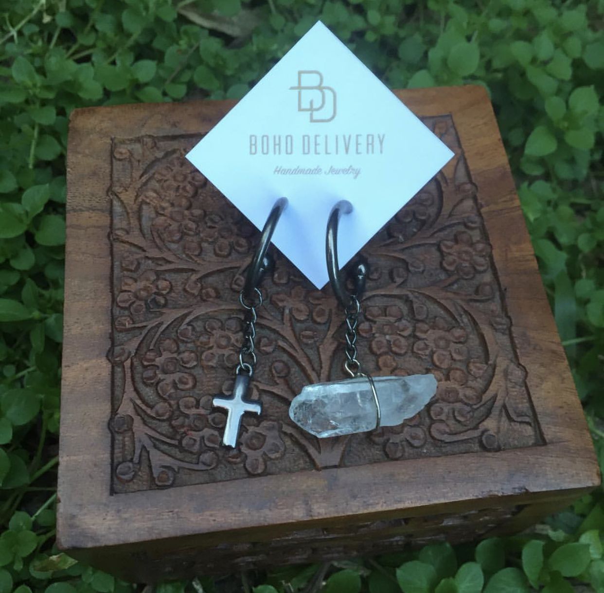 Argola em metal, pingente cruz e pedra Quartzo Branco.