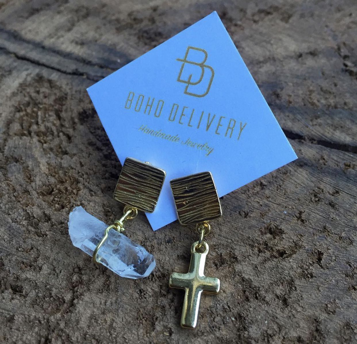 Brinco em metal dourado, pingente cruz e pedra quartzo branco,