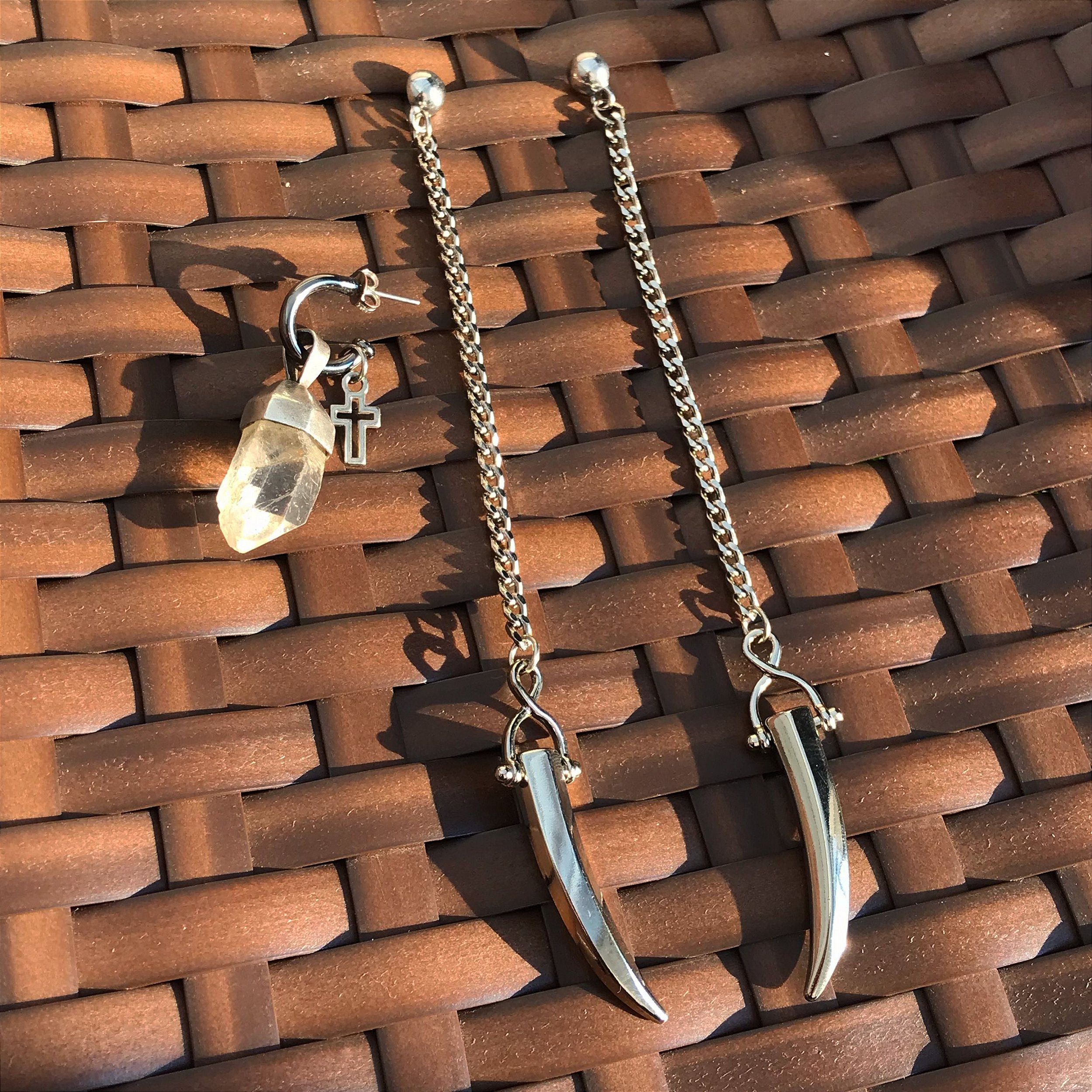 Brinco triplo em metal, pino e pedra quartzo branco.