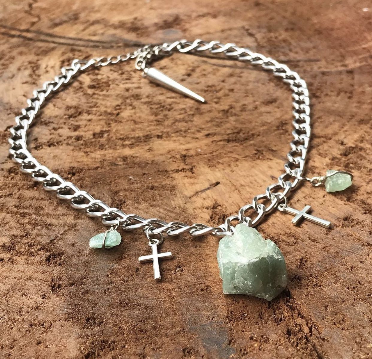 Colar em metal, pingente cruz e pedra quartzo verde.