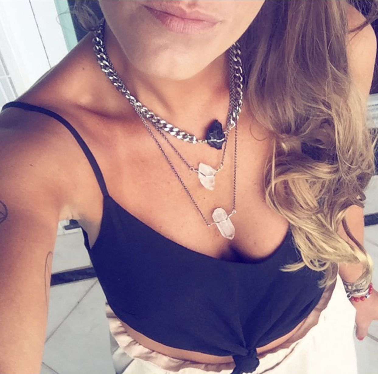 Colar triplo em metal e pedras ( Quartzo Branco e Turmalina Negra).