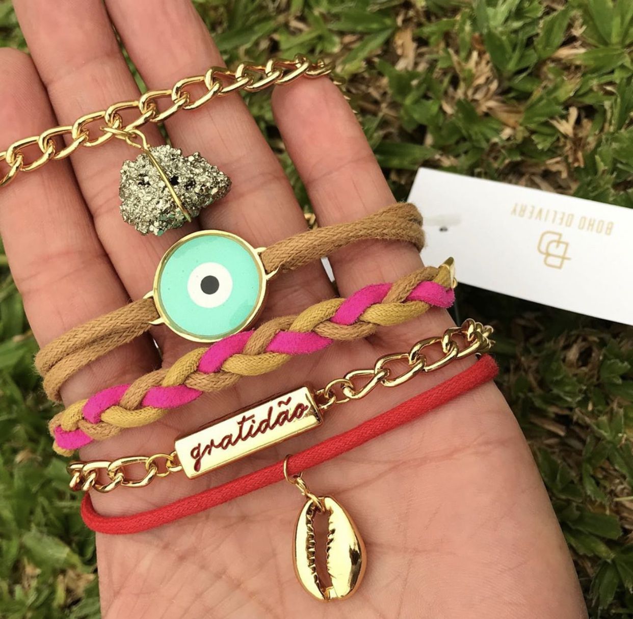 Kit com 5 pulseiras #pulseirismo Pirita, Olho Grego, Trançado, Gratidão, Buzios.